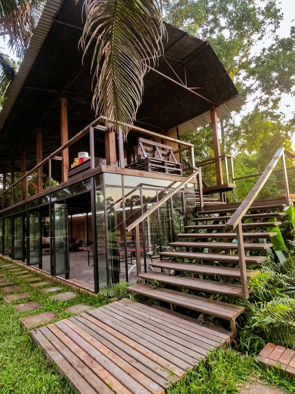 The ground floor can be converted into a conference room whereas the top floor can be used for leisure activities at any point in time. The top floor gives out a more laid-back vibe with the wooden floor, bamboo chic, windchime, and carpets whereas, the ground floor gives out an uptight modern minimalistic vibe with the mosaic floor, sofas, wall paintings, and lighting.
